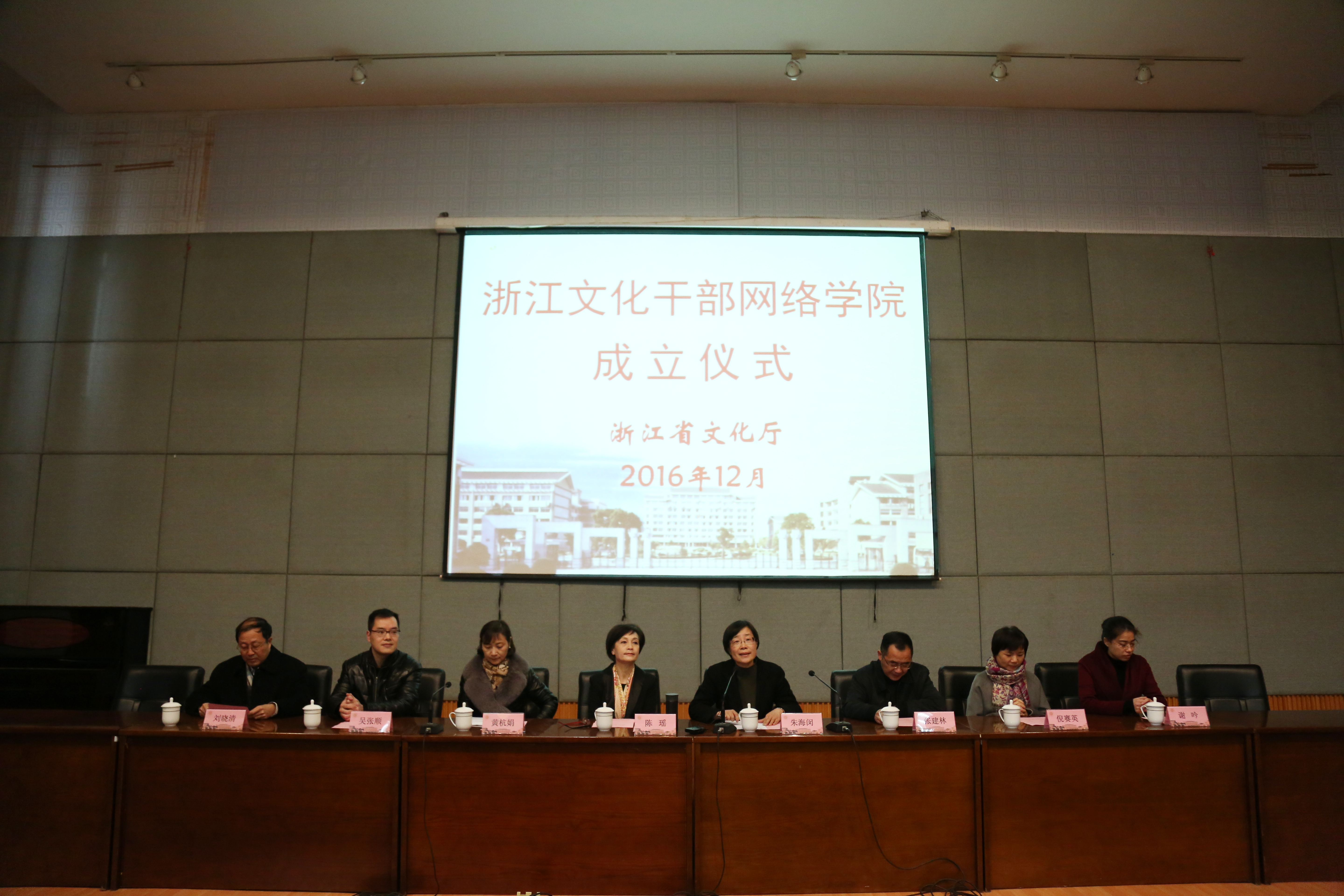 浙江省人力社保厅专业技术人员管理处副处长张建林、浙江省人事培训教育中心副主任吴张顺、浙江省文化厅人事处调研员倪赛英、浙江图书馆副馆长刘晓清、浙江省人事培训教育中心继续教育部部长谢吟等出席成立仪式,与浙艺师生共同见证了浙江文化干部网络学院的成立。