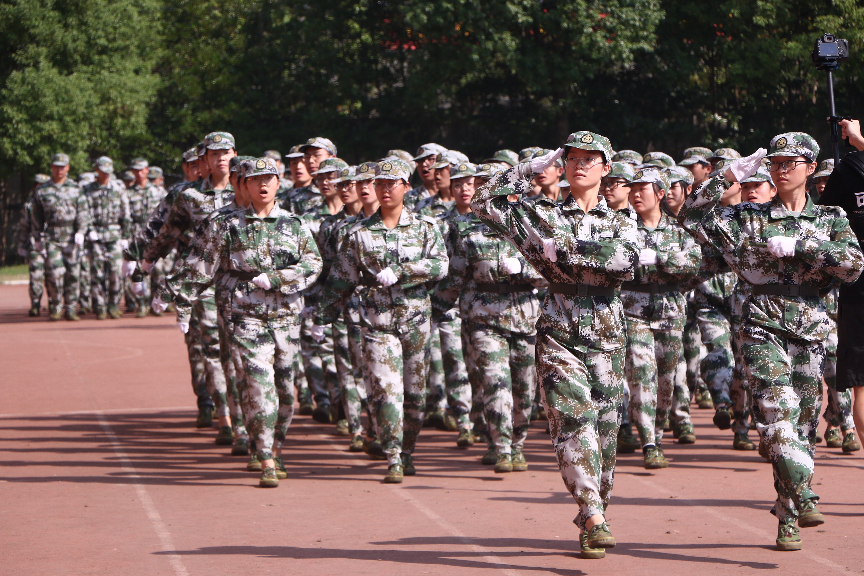 《义勇军进行曲》响起,全体新生用坚定的眼神凝望五星红旗缓缓升起,闭训仪式随即拉开大幕。党委副书记夏开堂代表学院党委检阅了新生军训队伍。各营排进行分列式军训汇报,“提高警惕,保卫祖国;扬帆把舵,奋勇拼搏,看我一排,气势磅礴;牢记担当,百炼成钢,再创辉煌……”,嘹亮的口号声在田径场上空回荡,这是发自内心的声音,响彻天空。经过军训的洗礼,同学们步伐有力、英姿昂扬,将这半月所学所练一一展现。方阵表演吸人眼球,军体拳表演、队列表演、战术表演,这支由各系最精英的成员组成的方阵,以精湛的军训动作展示,向老师和同学们致敬。