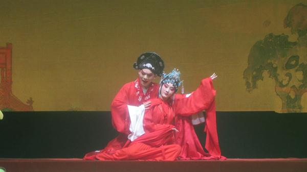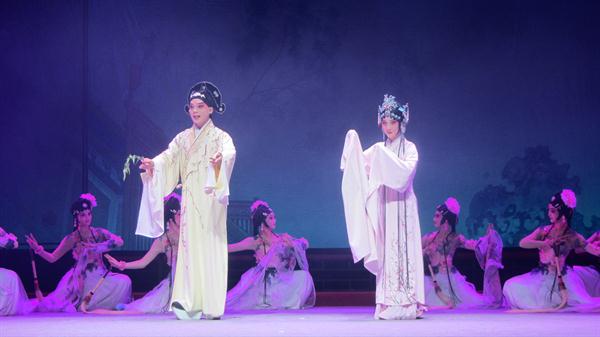 盛大的颁奖典礼过后,梦幻版昆剧《牡丹亭》正式登台。明代大戏剧家汤显祖所著传奇剧作《牡丹亭》将诗情、美蕴、哲思交融互汇,创作出中国浪漫文学的一座高峰,自问世400多年来,历演不衰,享誉海内外。梦幻版昆剧《牡丹亭》由浙艺戏剧系13级昆剧班、音乐系民乐教研室师生共同演绎,撷取原著“至情”之精华,以万紫千红的满园春色为映衬,用别开生面的艺术手法构筑起独特的意向空间,“惊梦”、“寻梦”、“离梦”、“追梦”、“幽梦”、“圆梦”6个主题先后贯穿始终,将杜丽娘和柳梦梅这对有情人的相思相悦演化成令人憧憬向往的绝美胜境,再现了缠绵400多年的生死至情和道不尽的前生缘、今世梦。浙艺版《牡丹亭》的所有演员都正值二八年华,是一部充满青春气息的剧作。为了突出与以往版本的不同亮点,梦幻版《牡丹亭》更是增添了翩然起舞的众花神、婀娜摇曳的柳树等具有极佳视觉效果的全新元素,一经亮相便艳惊四座。现场,落英缤纷的花瓣从舞台上方徐徐坠落,似真似幻的烟雾缓缓缭绕,仿佛真的将观众带入了这对年轻人情定终生的牡丹亭下。演出过程中,观众为杜丽娘、柳梦梅的秀雅所吸引,也为群演腾空、做打等绝活报以热烈掌声。演出结束后,热情的观众久久不愿离去,纷纷跑上舞台与演员合影留念。