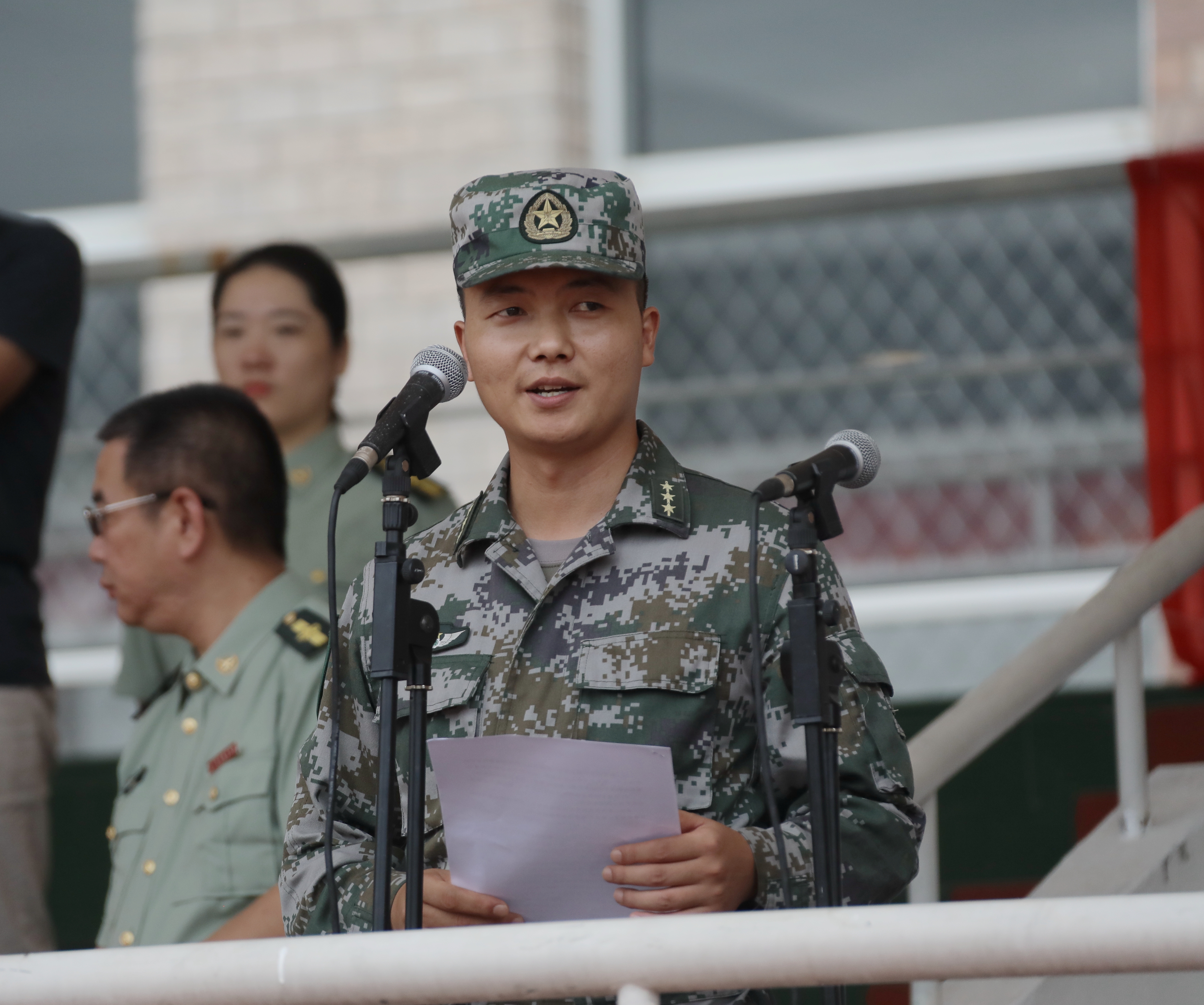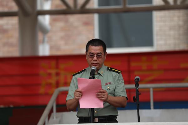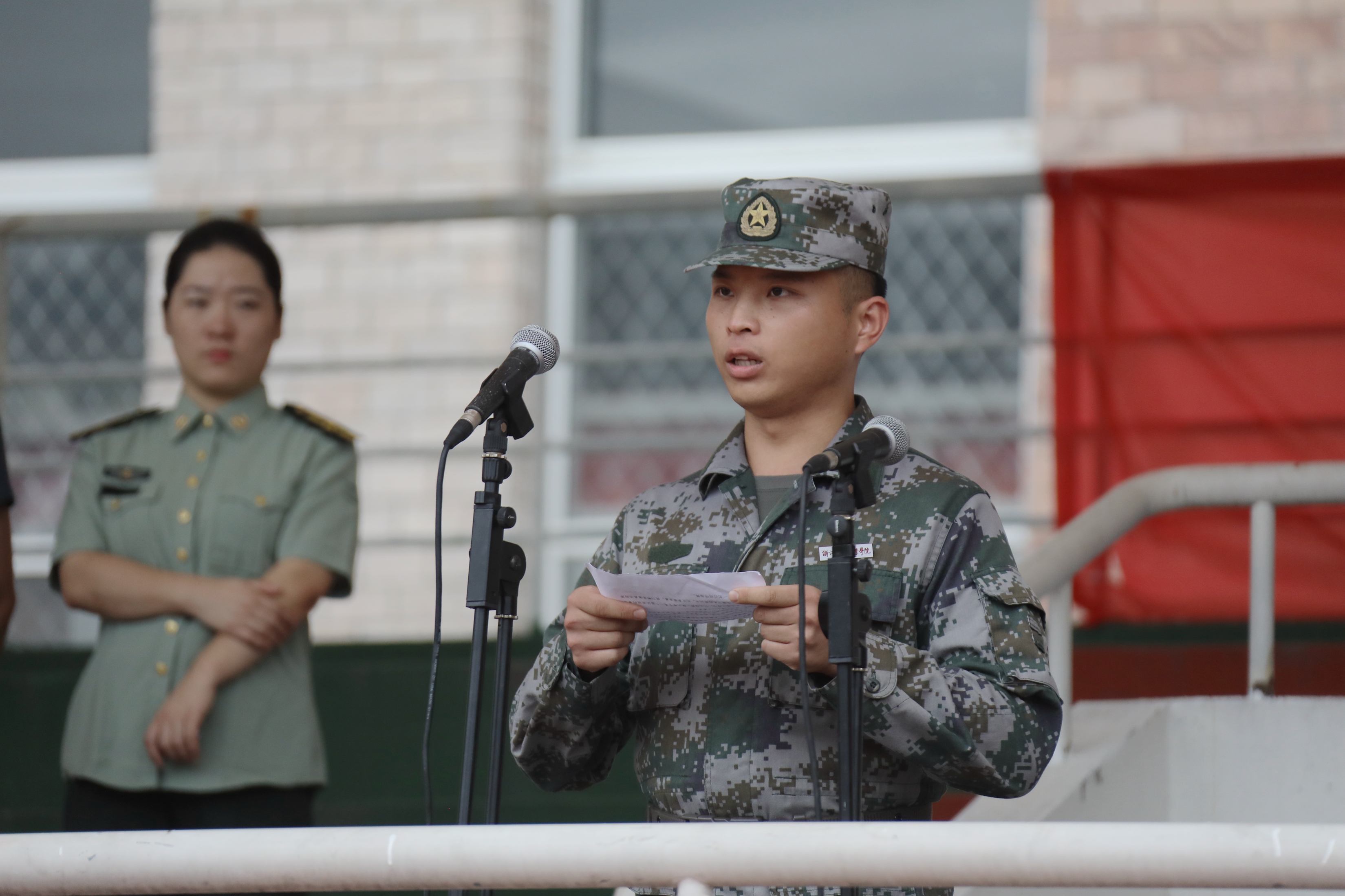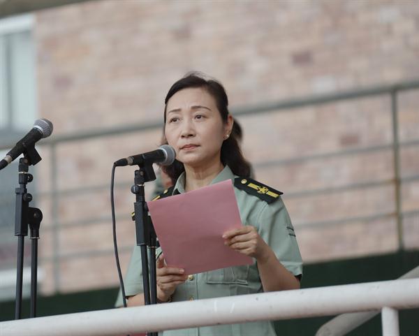 陈贝贝在仪式上发言。他希望全体教官牢记使命、不负重托,切实担起组训施教的重担。他也希望同学们端正思想、认真参训,积极投身紧张有序的军训生活。愿军训团全体同仁齐心协力抓军训,凝心聚力出成绩,确保军训全程安全顺利。
