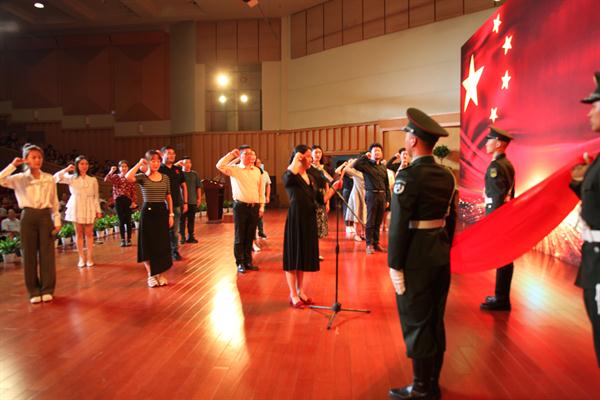 一年来新入职教师面向国旗宣誓入职。