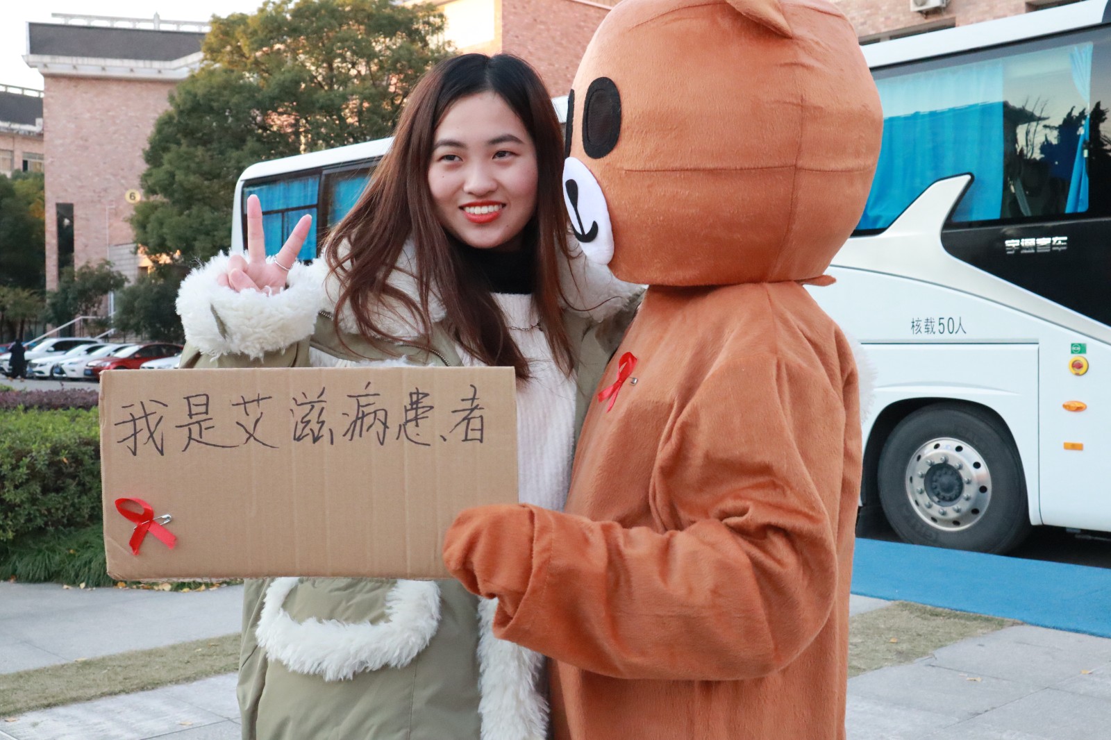 防艾知识宣传。12月1日起,校团委在学校中心广场设立防艾宣传点,向全校师生宣传防艾相关知识。身穿玩偶服的“艾滋病感染者”和大家互动拥抱,充分地让大家正视、尊重艾滋病感染者。往来的同学们更是在签名版上留下了自己对艾滋感染者的心语心愿。