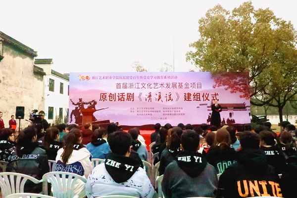 夏开堂作讲话,他代表学校,向参与话剧创作和演出的老师们、同学们致以问候,向中共长兴县委宣传部、长兴县文旅体局、长兴县文旅集团、长兴县煤山镇人民政府表示感谢。浙艺作为全国唯一一所入选“双高计划”的综合性高职艺术院校,话剧《清溪谣》的创作是戏曲表演专业建设群的一项成果。在全党上下正在开展党史学习教育之际,话剧《清溪谣》开排适逢其会,他要求浙艺师生们讲好中国共产党故事,创作和演绎展示党的伟大历程、伟大成就的优秀作品,为“文化浙江”“诗画浙江”建设提供有力人才支撑,在浙江“重要窗口”建设中发出浙艺声音、贡献浙艺智慧。