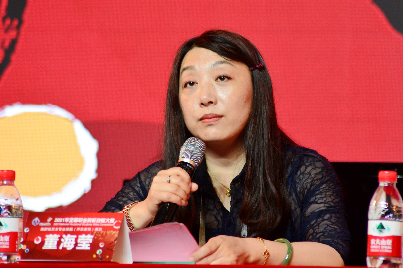 赛项裁判组组长、新谱视唱裁判、中国音乐学院附中理作学科副主任董海莹代表本次大赛的裁判员们对获奖选手送上了诚挚祝贺。她就此次大赛新谱视唱环节的分值权重以及各院校选手的表现状态作了点评:今年的声乐大赛,教育部将新谱视唱的评分占比、分值权重设为10%,希望推动学生们的学习积极性和重视度,同时全面提升专业基础课程的掌握,最终提升其专业综合实力。她提到了本次新谱视唱环节中的一些具体问题:一是用首调演唱的学生,请先从理论上认真分析视唱新谱的调式结构,仔细区分大小调的音级关系,才能准确判断首调演唱的第一个音,应该从哪个音开始 才是准确的首调演唱。这是最重要最根本的能力;二是加强基本节奏的准确度,不要含混不清,随意延长或收缩;三是节拍韵律的强弱音乐表现没有考虑完善。希望未来在平常的训练中重视起来。
