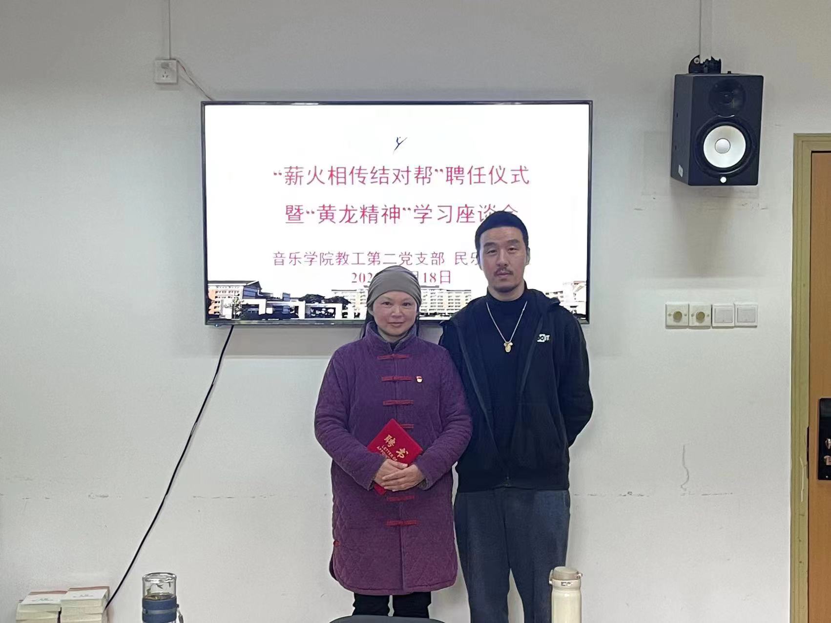 4月18日,音乐学院教工第二党支部、民乐教研室在3101党员之家举行“薪火相传结对帮”聘任仪式暨“黄龙精神”交流分享。吴樟华、朱学富、陆曙鸣、马崊等4位正高职称党员教师受聘结对4名青年教师,并作“黄龙精神”与教书育人心得分享。支部党员、民乐教研室全体教师参加。