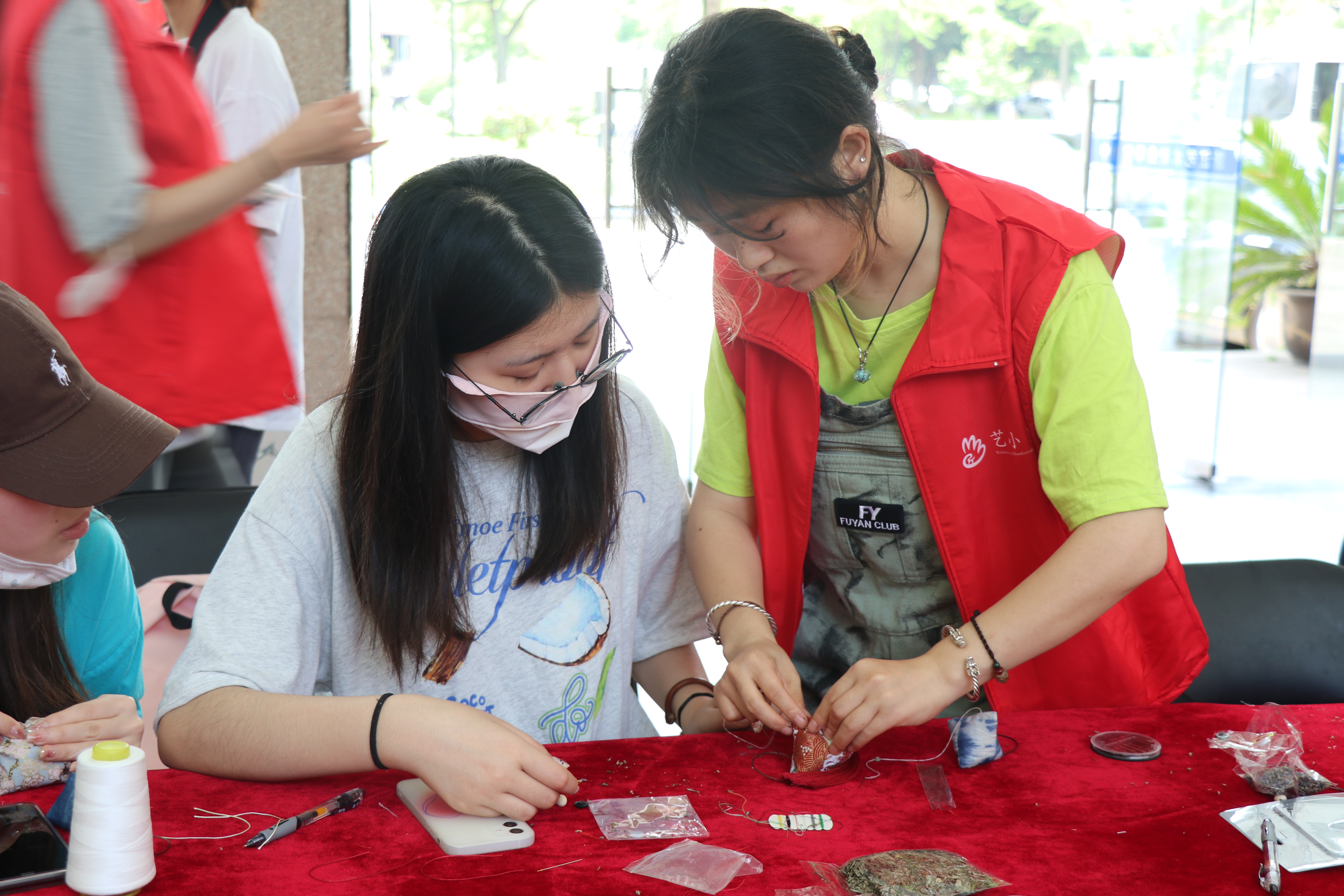 在制作香包之前,艺小匠志愿者详细讲解了制作香包的步骤和注意事项。介绍完之后,由艺小匠志愿者们带领老师和同学们制作香包。