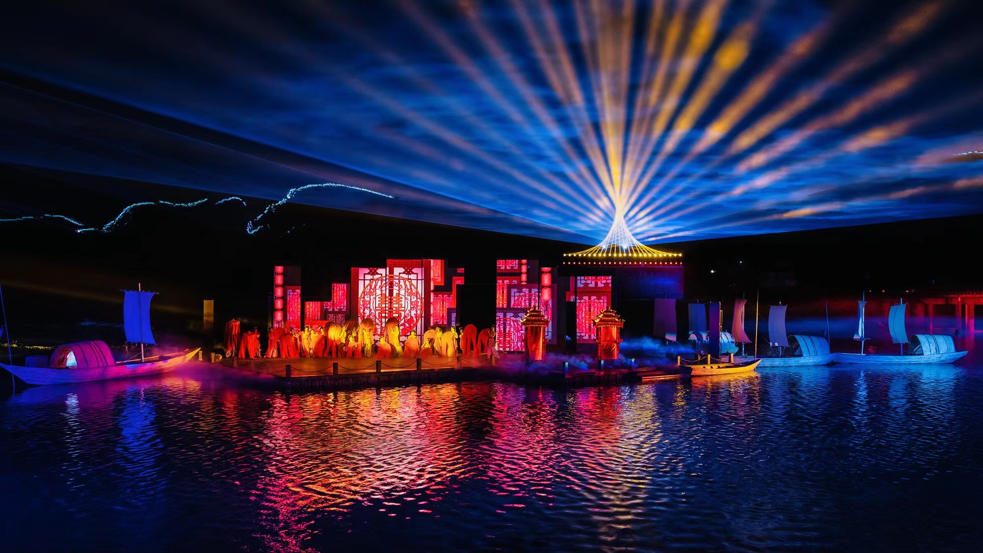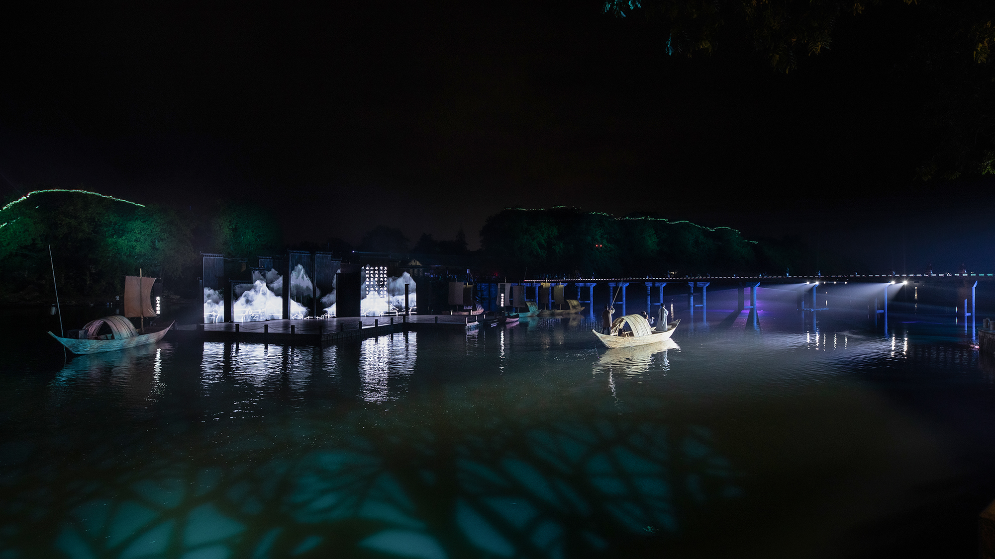 周正平一直对于艺术创作有独特的见解,被中国艺术界誉为“灯光诗人”。本次展览中,周正平的作品有越剧《红玉》和山水剧场《清溪江湖》。《红玉》的灯光设计融入舞美整体空间的韵律,又作为流动的画笔自成体系。在白色调的空灵布景中,使用和谐的色彩和精致的笔触,描绘出简约诗化的情境。在创造意象空间的表现手法上,运用富有张力和节奏感的光影,既刻画了表演动作,又强化了全女班演员在武戏上的阳刚气质。将繁复的技术手段和凝练的艺术构思隐藏在诗意画面背后,通过光形成视觉语汇,与观众进行情绪对话。在《清溪江湖》中,周正平让视觉艺术进入清湖古镇的整体公共空间,既是对沉睡着的江山文化的唤醒,也是他游走半生对故乡的献礼。